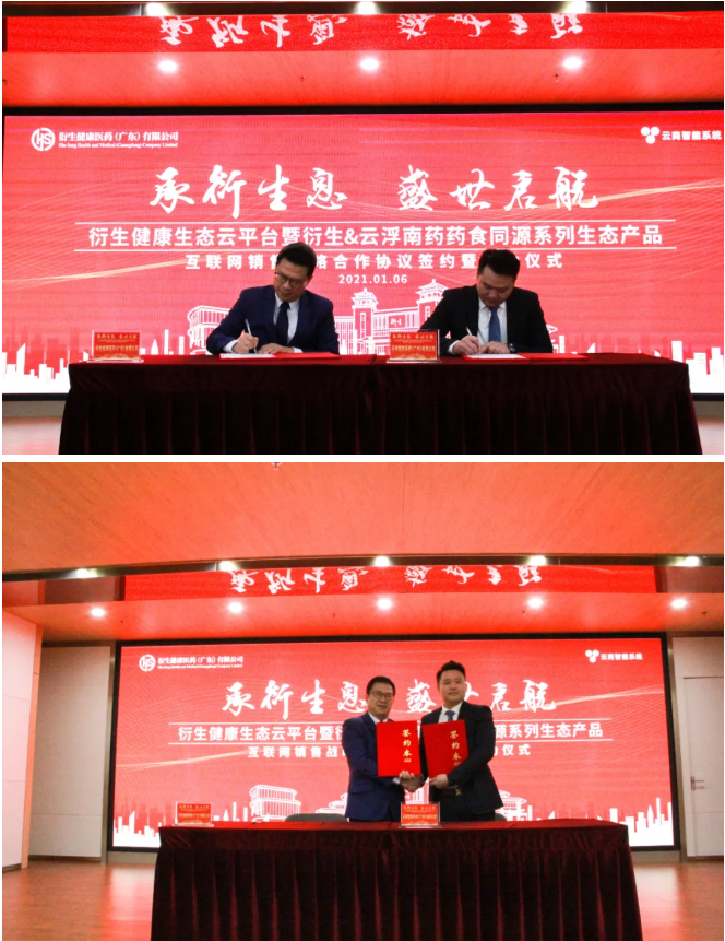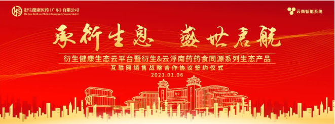 1月6日,衍生健康医药(广东)有限公司与云商智能系统(广州)有限公司(源点科技)在衍生健康医药产业园隆重举行:衍生健康生态云平台暨衍生@云浮南药药食同源系列生态产品互联网销售战略合作签约暨启动仪式 。