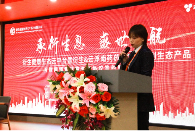 仪式上,衍生健康医药(广东)有限公司市场部总监覃珊女士做为项目对接人介绍了本次双方合作签约背景,她表示:“本次双方的合作介于两个最火的市场关键词:一是健康;二是互联网+时代。在过去的2020年一场疫情推动了全世界人民对“健康”的意识!而 “全民健康-坚持预防为主、倡导健康文明生活方式”更是列入了十九大会议“健康中国战略”的一个重要方针!衍生集团一直专注「妇儿,中医,中药,医疗」版块,致力于中医文化传承、中医药及“药食同源”健康产品的科研、生产、市场销售业务,并以中医文化“药食同源“防范于未然 的健康调理系列产品收获了社会各界及消费者的认可。同时,衍生集团于2018年投建、2020年投入使用、建筑面积达72680平方米的衍生健康医药产业园,正式落户云浮,筑建中医文化特色及“药食同源”大健康产业产品供应与服务链!